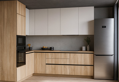 Заказывали кухню вместе со всей необходимой встроенной техникой. Были удивлены, что встроенная микроволновая печь меньше по вмещаемости. Хотя менеджер предупреждал об этом. В целом очень довольны приобретением. Качественные доводчики, фасады не скрипят. Визуально очень красиво смотрится.