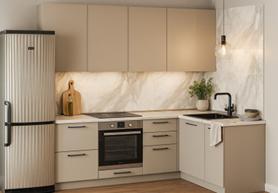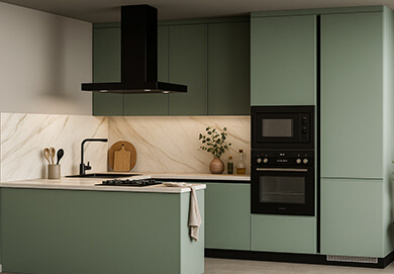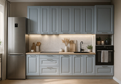 Заказывали кухню вместе со всей необходимой встроенной техникой. Были удивлены, что встроенная микроволновая печь меньше по вмещаемости. Хотя менеджер предупреждал об этом. В целом очень довольны приобретением. Качественные доводчики, фасады не скрипят. Визуально очень красиво смотрится.