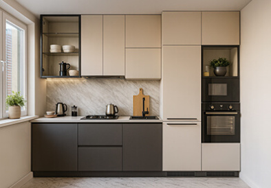 Заказывали кухню вместе со всей необходимой встроенной техникой. Были удивлены, что встроенная микроволновая печь меньше по вмещаемости. Хотя менеджер предупреждал об этом. В целом очень довольны приобретением. Качественные доводчики, фасады не скрипят. Визуально очень красиво смотрится.